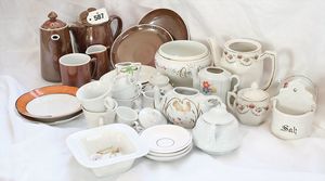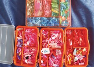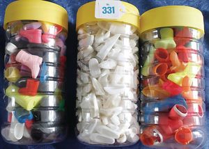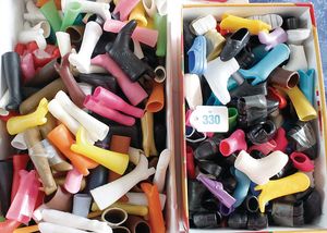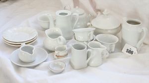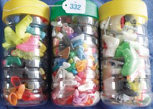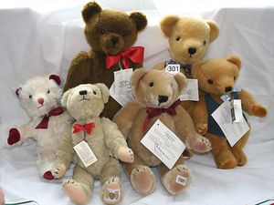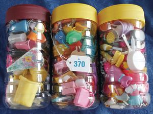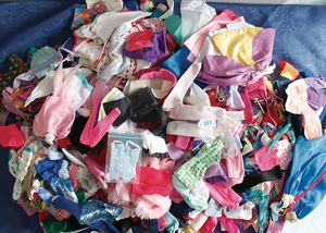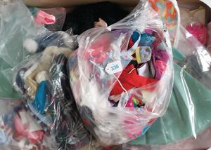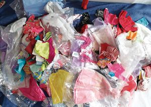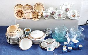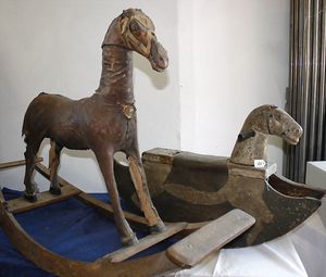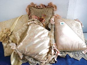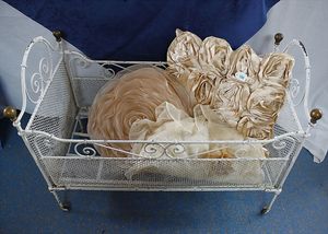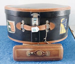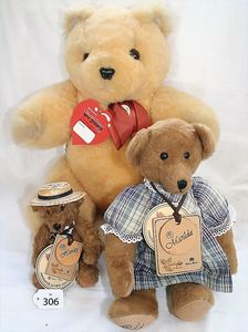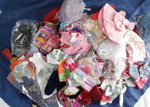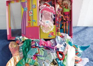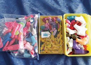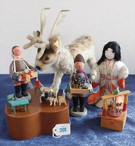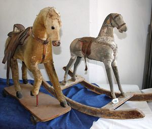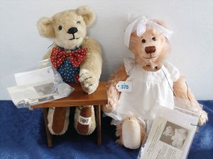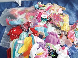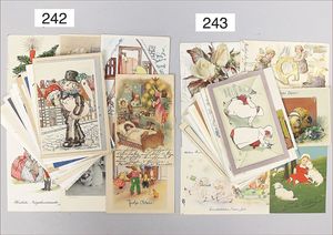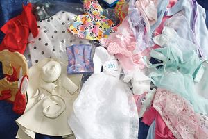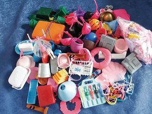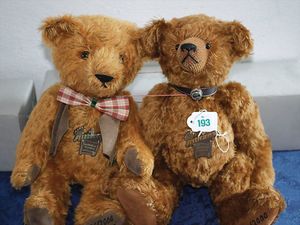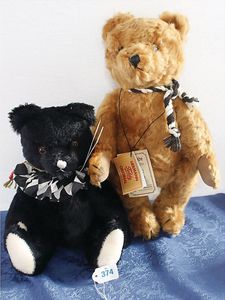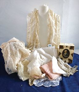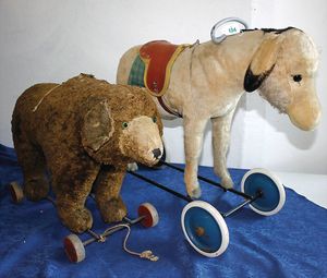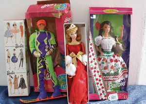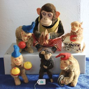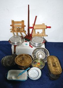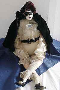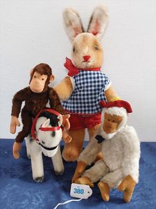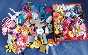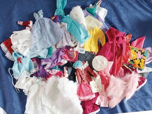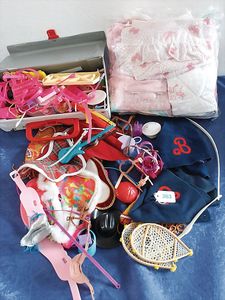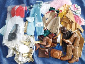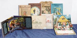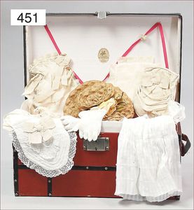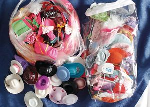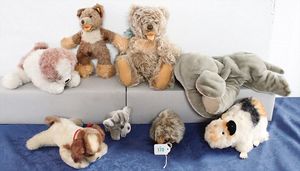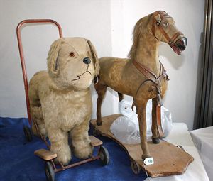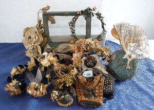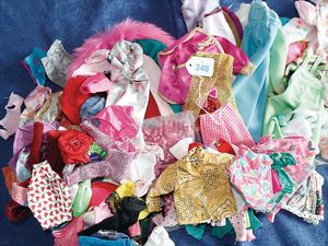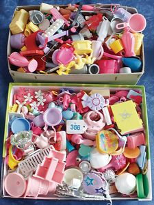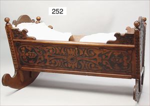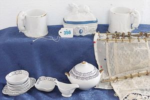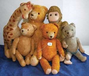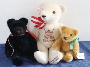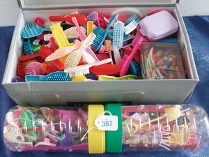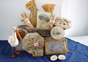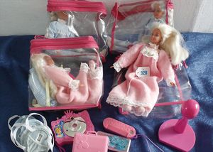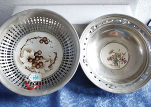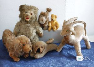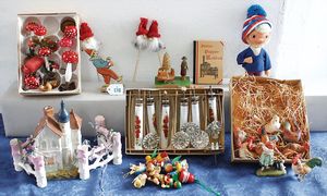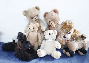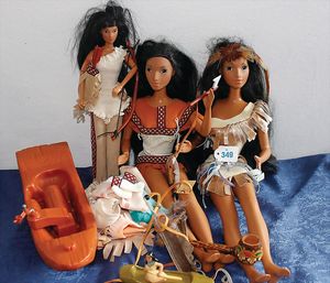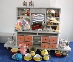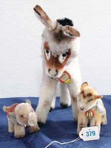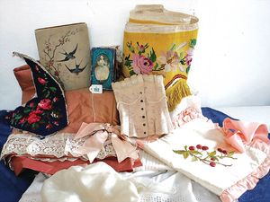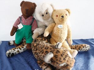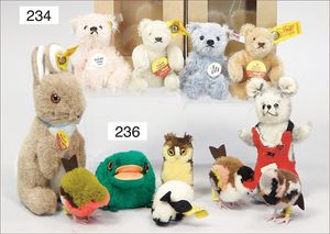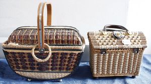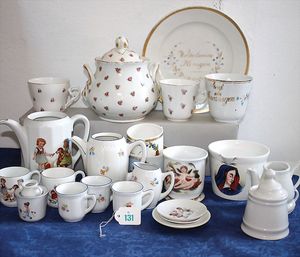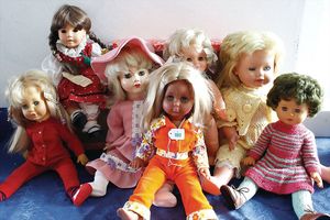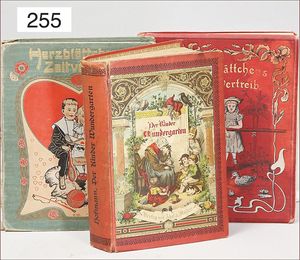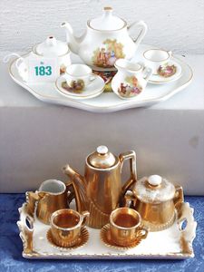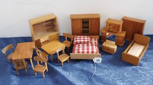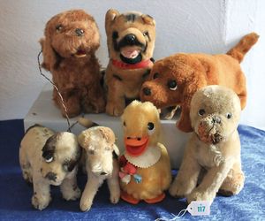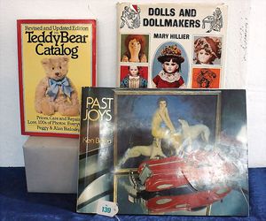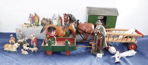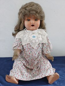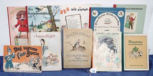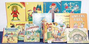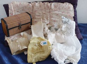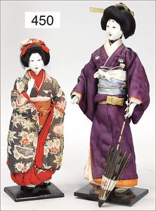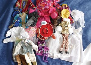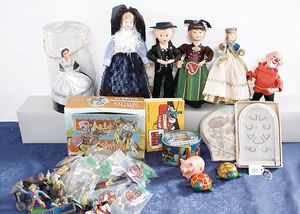 3 kl. Porzellankopf-Puppen, 1 x Brustblatt, gem. AM, blaue Schlafaugen, off. Mund, Zähne, Echthaarperücke, Stoffkörper, Porzellanarme, 25 cm, 1 x gemarkt Germany, braune fest eingesetzte Glasaugen, offf. Mund, Zähne, Echthaarperücke, Masse-Stehkörper, mit anmodellierten Stiefeln u. Strümpfen, 20 cm, 1 x gemarkt F. & W. Goebel 120, blaue fest eingesetzte Glasaugen, off. Mund, Zähne, Echthaarperücke, Masse-Stehkörper, anmodellierte Schuhe u. Strümpfe, 17 cm, dazu 2 Teile Korbmöbel