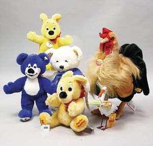 STEIFF Collie, komplett, Nr. 250.25, dazu 2 Wollminiaturen, mit Knopf u. Fahne, 3 Wollminiaturen ohne Knopf u. Fahne