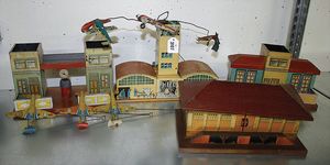 Konv. Blech-Spielzeug, stark bespielt, einige Teile fehlen, 2 x Bahnhof, Schuppen, 1 x Flughafen-Gebäude, mit einige Flugzeugen, verformt