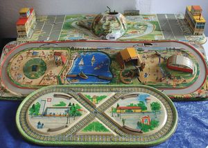 3 Blech-Bahnen, bespielt, nicht komplett, 1 x Eisenbahn, Länge 45 cm, 1 x Flugplatz, 70 cm, 1 x Campingplatz, 72 cm, Kleinteile u. Fahrzeuge fehlen