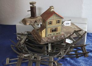 BING Bahnwärterhäuschen, mit Läutewerk, dazu einige Teile Gleismaterial, alles stärker bespielt