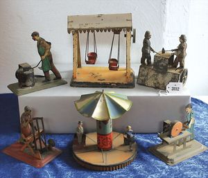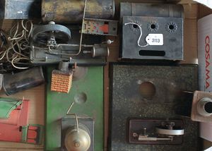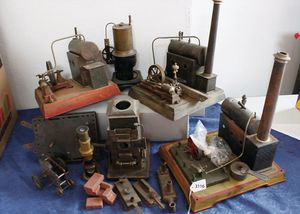 Konv. 4 Dampfmaschinen, 2 x auf Holzsockel montiert, alles stark bespielt, Kleinteile fehlen, (Ersatzteilspender), 1 stehende Dampfmaschine, dazu 1 Laterna Magica, mit Handkurbel, gemarkt Germany E.P. (Ernst Plank), nicht komplett, einige Steine für 1 Anker-Steinbaukasten, u. anderes