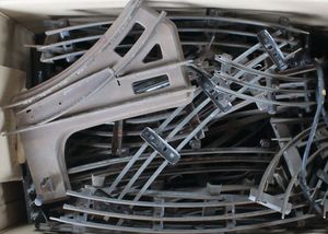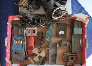 Fundkiste, Blechteile v. Blech-Fahrzeugen, Lkw, Tank, Bahnwärterhäuschen, 1 Tender, 1 Waggon, 1 Antriebsmodell, dazu gr. Konv. Gummiketten f. Tank, versch. Gr. u. Breiten