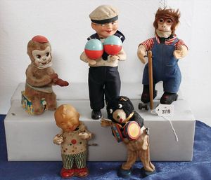 Konv. 5 Aufziehfiguren, Uhrwerke intakt, 1 x Schuco Affe, Augen fehlen, 1 x Matrose, Schuhputzaffe, Kind mit Seil u. Bär, wohl Made in Japan
