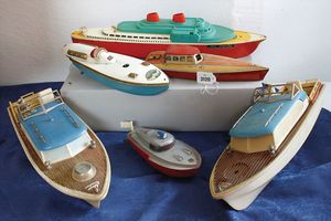 Konv. 6 Boote, Blech u. Kunststoff, versch. Hersteller, u.a. Schuco, alles stärker bespielt, Kleinteile fehlen