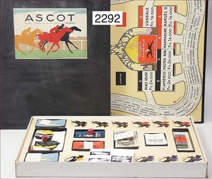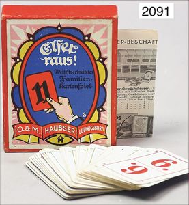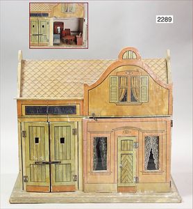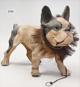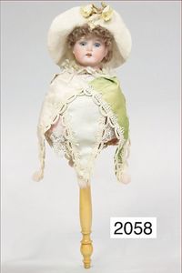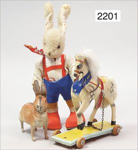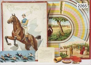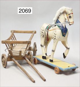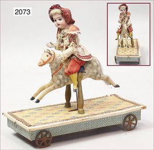 Puppenautomat, Biskuitporzallen-Kurbelkopf, gem. 1094, fest eingesetzte blaue Glasaugen, off. Mund, oben 2 Zähne, Holz-Drahtkörper, auf Holzpferd, Fell bezogen, Lederohren, auf Holz-Zugspiel, mit Gussrädern, mit lithogr. Papier beklebt, Länge 29 cm, Breite 13 cm, Höhe 30 cm, wohl franz.