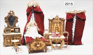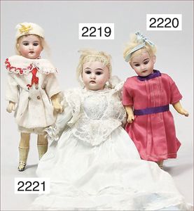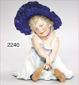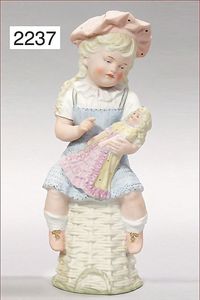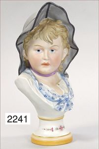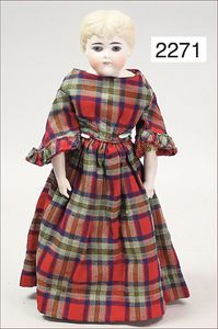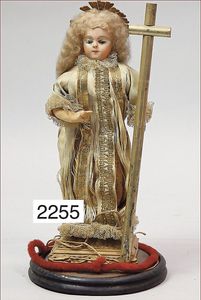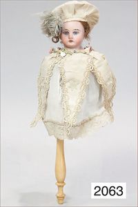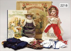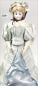 ausgef. franz. Schwimmpuppe, Biskuitporzellankopf, wohl Gaultier, fest eingesetzte blaue Glasaugen, geschl. Mund, durchst. Ohren, Einbindekopf, Biskuit-Hände, orig. Gummi-Beine, mit altersbed. Verformungen, Uhrwerk ein wenig schwergängig, jedoch intakt, alte Kleidung