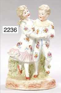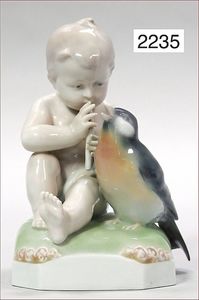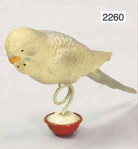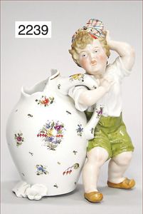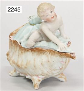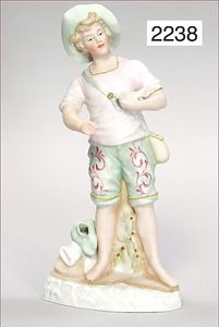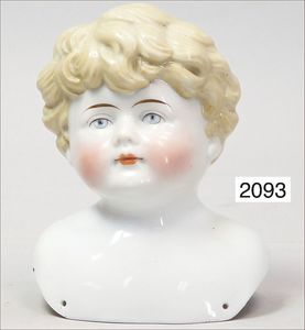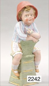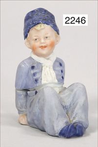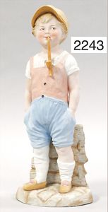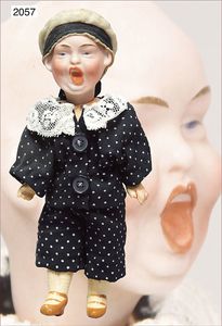 Schreier, Biskuitporzellan-Kurbelkopf, 16 cm, blaue gemalte Augen, weit aufgerissener Mund, leicht abstehende Ohren, Masse-Stehkörper mit anmodellierten Schuhen u. Strümpfen