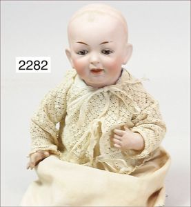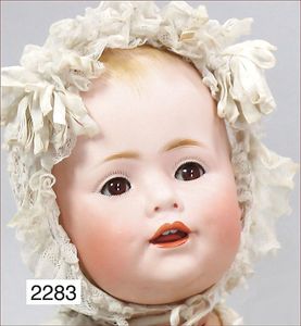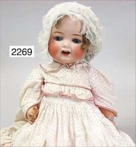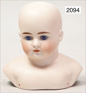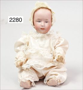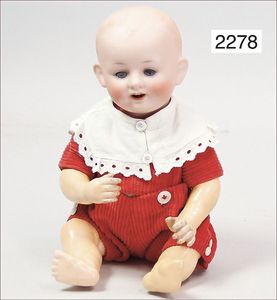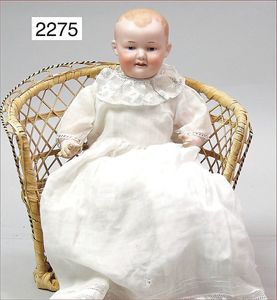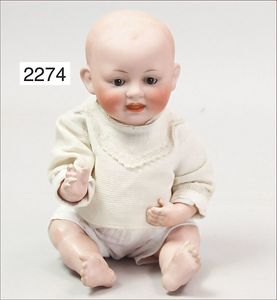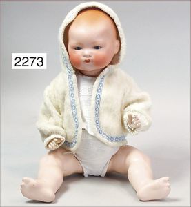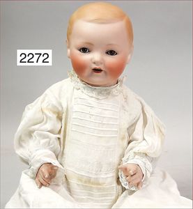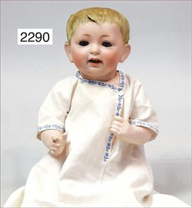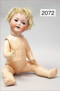 HEUBACH KÖPPELSDORF Biskuitporzellan-Kurbelkopf, gem. 342.8, blaue Schlafaugen, off. Mund, oben 2 Zähne, Stehbabykörper, stark ausgebessert, 58 cm, ausgegangene blonde Mohairperücke