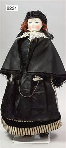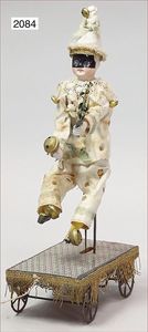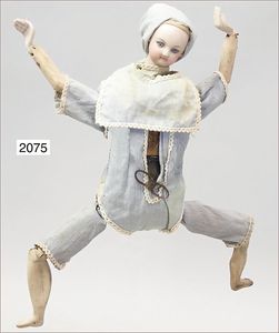 wohl ZINNER Zugspiel, Harlekin, mit Maske, 36 hoch, Biskuitporzellan, Einbindekopf, blaue fest eingesetzte Glasaugen, Wulst-Drahtkörper, Orig.-Kleidung