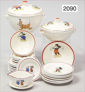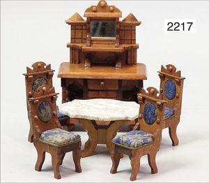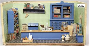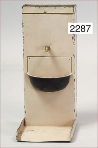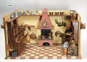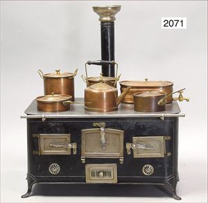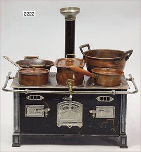 FISCHER Puppenküchenherd, um 1900, 42,5 breit, 50 hoch, Türen vernickelt, original Topfsatz Kupfer, Wasserschiff mit Ablasshahn, zwei Töpfe, zwei Topfpfannen, eine Topfpfanne wohl nicht original, schöner Allgemeinzustand, mit Brenner, dekorativ auch für eine große Puppe