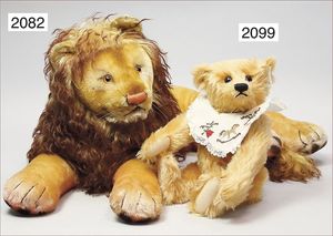 STEIFF Leo, liegend, mit silbernen Knopf, Reste der gelben Fahne, 61 cm, guter Zust., gelbe Fahne stark bespielt