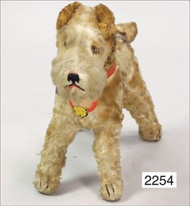 STEIFF Hund, 30 cm, 5-fach gegliedert, Knopfaugen, mit Knopf, Druckstimme defekt, teilw. Mohairverlust