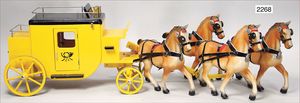 wohl Rock & Graner, Biberacher Blech, Kutsche, ca. 1880, mit 2 Zink-Pferden, Kutscher, 2 Personen, schöner Orig.-Zust., mit altersbed. Lackfehlern, museal, 30 cm