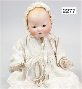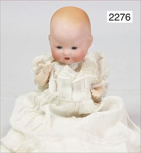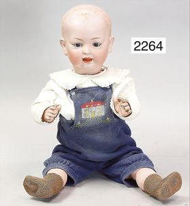 SCHILDKRÖT Bebi, 1925, 67 cm, Celluloid, Kurbelkopf, braune gemalte Augen, off./geschl. Mund, anmodellierte Zähne, Sitzbabykörper, an den Schläfen ausgebessert, kaum sichtbar, absolut seltene Größe