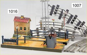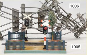 MÄRKLIN Bahnübergang, Spur 0, elektr. Ausführung, mit 2 beleuchteten Andreaskreuzen, welche beim Durchfahren des Zuges ausgelöst werden, guter Zust., kl. Lackfehler an Andreaskreuzen