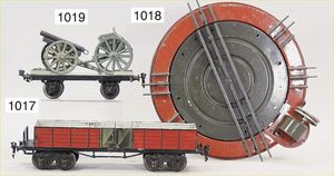 MÄRKLIN Spur 1, Uralt, Militärtransportwagen mit Kanone, 2-achsig, altes Märklin-Zeichen, Blech handlackiert, 21 cm, teilw. farbl. etwas ausgebessert