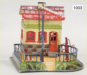 MÄRKLIN Uralt, Wärterhaus mit Treppe, halbrunder Sockel, mit Bank, Brunnen, Zaun und Signal, Grundplatte 14,5 cm x 16,5 cm, Höhe 15 cm, Orig.-Zust., mit altersbed. Lackfehlern