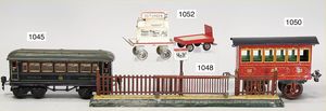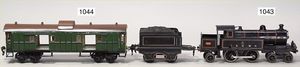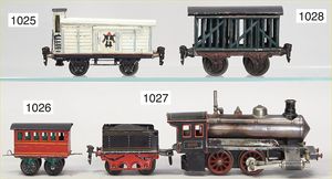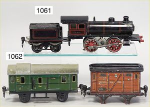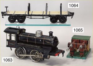 schöne Fundkiste, Eisenbahn, Spur 0, wohl Karl Bub, Schlepptenderlok B, Ersatzteilspender, nicht kompl., dazu 2 Niederbordwagen, einige Teile Gleismaterial, Holzteile, Wasserbehälter mit Ablasshahn, Märklin Laterne, mit Gusssockel, nicht kompl., Oberteil liegt lose bei, 1 Tischgrammophon, Induphon 138, Phonkopf fehlt, Einsatz Nadeln, Uhrwerk intakt, Durchm. 24 cm, nicht fotografiert