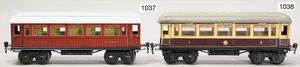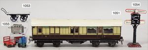 BING Spur 0, 4-achsiger englischer Sitzgepäckwagen, mit Profilgussrädern, 33 cm, Dach farbl. überarbeitet, sonst bespielt, gut, selten