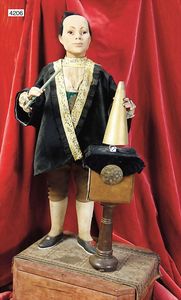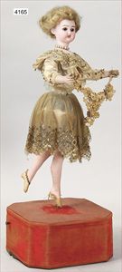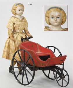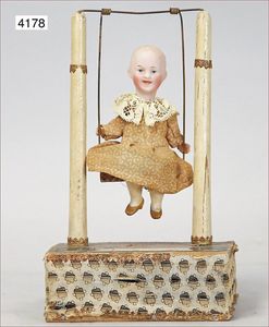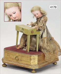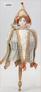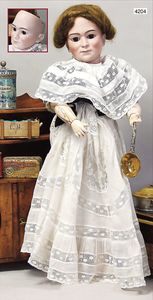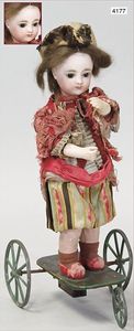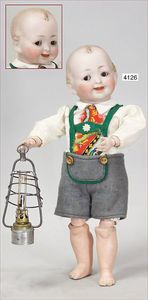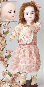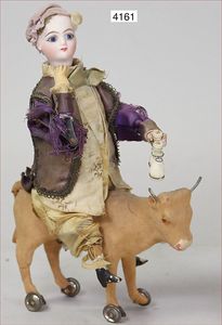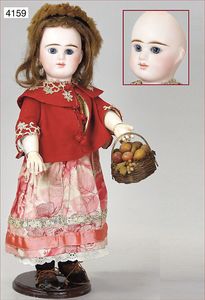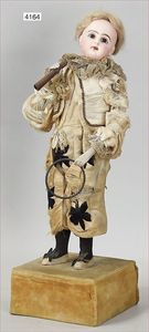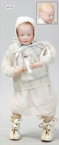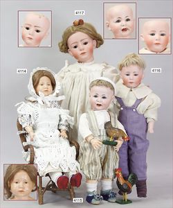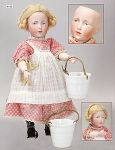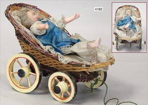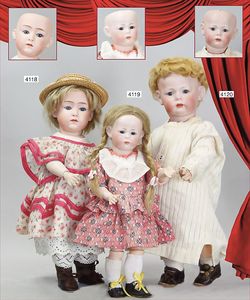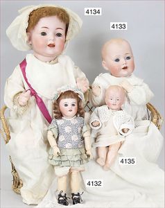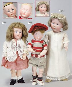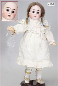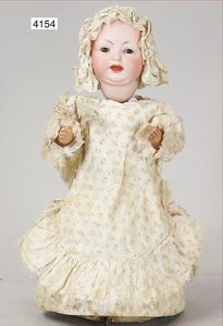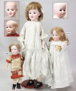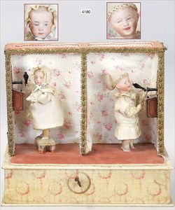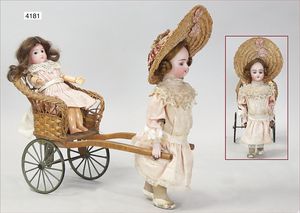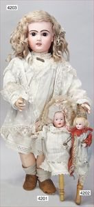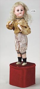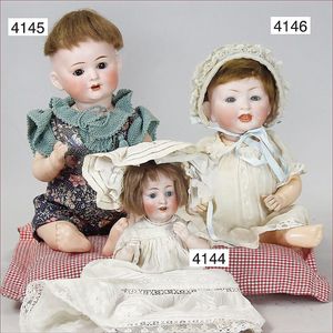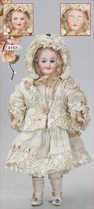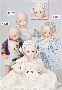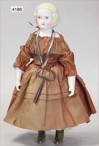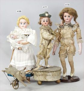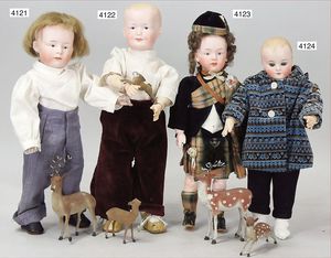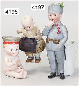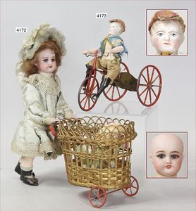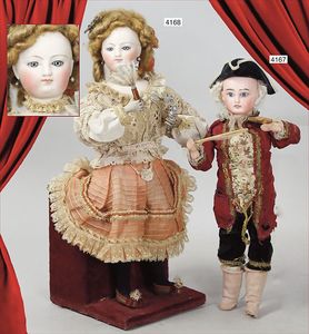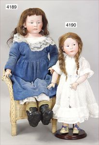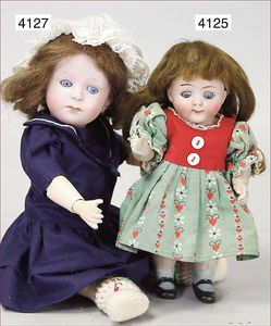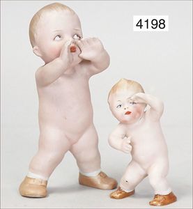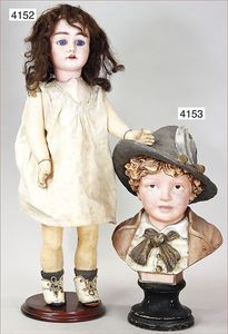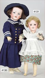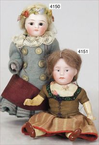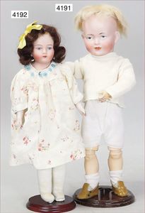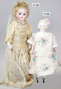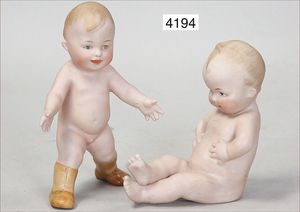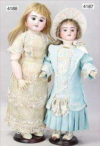 Biskuitporzellan-Geradhalspuppen, 1 x Mädchen, fest eingesetzte blaue Paperweightaugen, geschl. Mund, Vollkopf, Mohairperücke fest aufgeklebt, auf Steh-Gliederkörper, feste Handgelenke, alte Kleidung, schönes helles Porzellan, ca. 22 cm Stehhöhe, dazu Junge, Vollkopf, fest eingesetzte blaue Paperweightaugen, geschl. Mund, fest aufgesetzte Mohairperücke, wurde nicht entfernt, Risse im Gesicht, Stehkörper, feste Handgelenke, ca. 23 cm Stehhöhe, schönes Konv.