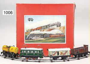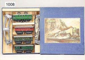 KARL BUB Zugpackung, Spur 0, Elektrolok B, Uhrwerkausführung, 2 Personenwagen, Güterwagen, neuwertig, Orig.-Kart.