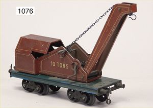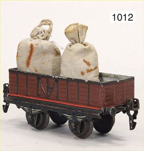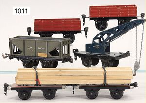 MÄRKLIN Konv., Spur 0, Güterwagen, 2-achsig, 3 Teile, 2 x Hochbordwagen, altes Märklin-Zeichen, 1 Kranwagen, dazu 1 Schnittholzwagen, 4-achsig, 1 Schüttgutwagen, BING; Blech lithogr., Zust. 2