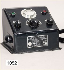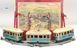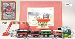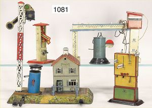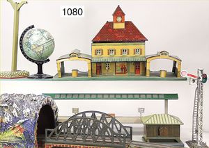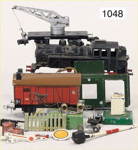 Konv. Eisenbahn, 3 Transformatoren, 30er Jahre, techn. nicht geprüft, 1 Widerstand, Tunnel, Masse, Bing, Spur 0, Brücke mit Auf- und Abfahrrampe, Signal, 2 Bahnsteigüberdachungen, 1 Bahnhof, Grundplatte 46 x 18,5 cm, Blech lithogr., etwas verbogen, 1 Lokschuppen, KBN, bespielt bis gut, 1 Blech Globus, guter Zust.