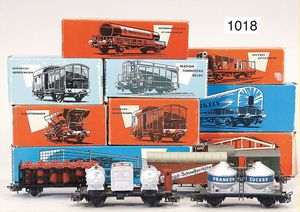 MÄRKLIN H0, 8 Teile Güterwagen, Kranwagen, Holzwagen, off.. Güterwagen, Schüttgutwagen, alles guter Zust., im Orig.-Kart., dazu 4 Güterwagen ohne Kart.