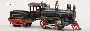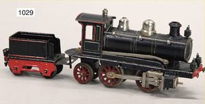 MÄRKLIN Spur 1, Schlepptenderlok B (Schienenräumlok), Uhrwerk intakt, schwarz, mit grünen u. roten Zierlinien, bespielt, kl. Stellen ausgebessert, 2-achsiger Tender, amerikanische Ausführung