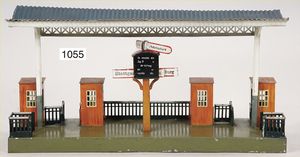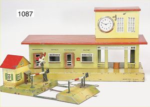 KIBRI Bahnhof, mit Uhr, Funktion nicht geprüft, bespielt, altersbed. Lackfehler, Grundplatte 45 x 18 cm, dazu passend 1 Bahnübergang, mit Bahnwärterhäuschen u. Schranke