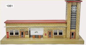 KIBRI Bahnhof, Blech, Grundplatte 67 cm x 18 cm, Buffet, Fahrdienst, Wartesaal, Gepäckabgabe, seitl. Turmteil, Dach am Turmteil ergänzt, kl. Stellen ausgebessert