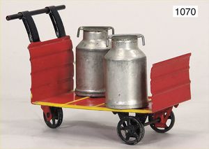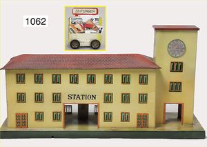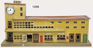 MÄRKLIN Bahnhof, mit Turmteil, Blech, Grundplatte 52 cm x 19 cm, einige Stellen farbl. ausgebessert, kl. Dach ergänzt, mit Zeitungswagen, Räder ergänzt