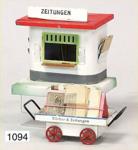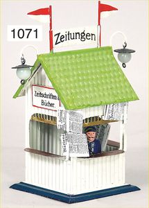 KIBRI Zeitungskiosk, Blech, Grundplatte 8 x 10 cm, dazu 1 Zeitungswagen Märklin, mit alten Zeitungen