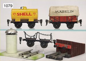MÄRKLIN Spur 0, 3 Güterwagen, 2-achsig, Tankwagen, Shell, 1874, Planenwagen, Rungenwagen, Runge liegt lose bei, ohne Schraube, Läutewerk mit Zugbeeinflussung, bespielt