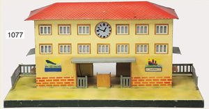 MÄRKLIN Bahnhof, mit Uhr, Grundplatte 62 x 21 cm, Höhe 34 cm, bespielt, Stuhllehnen an der Sitzreihe weggebrochen, Federwerk der Uhr intakt