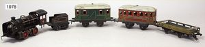 DOLL Spur 0 Schlepptenderlok B, elektr. Ausführung, techn. nicht geprüft, dazu 1 2-achsiger Personenwagen, 1 Gepäckwagen, 17 cm, bespielt, 1 Güterwagen, Bing, ohne Achsen, bespielt