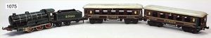 BING Schlepptenderlok 2C, 3-achsiger Tender, Blech lithogr., grün mit gelben Zierlinien, 40 cm, Mitropa-Schlafwagen, 12811, Mitropa-Speisewagen, 2281, 4-achsig, 31 cm, mit Inneneinrichtung, Blech handlackiert, bespielt, altersbed. Lackfehler, 1 Wagen ein wenig verbogen, Lok, Vorläufer fehlt, bespielt, Uhrwerk intakt