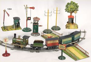 ISSMAYER Storchbeinlok, Blech lithogr., etwas kleiner als Spur 0, ca. 1895, Schlepptenderlok 1A, 3 Personenwagen, Gleise, Bahnwärterhäuschen, mit Halteschild u. Baum, 2 Telegraphen, Flügelsignal, Brücke, Bahnwärterhäuschen, mit Schranke u. Signal, Läutewerk, 2 Schilder, Uhrwerk der Lok defekt, schöner Orig.-Zust., museal