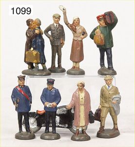 Konv. Spur 0, Lineol u. andere, Massefiguren, 7 Teile, Eisverkäufer, Reisende, Kofferträger, Wanderer, 5,5 cm, Zust. 2