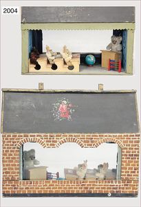 kl. Bärenschule, 43 cm breit, 33,5 cm hoch, kl. einfaches Puppenhaus eingerichtet als Bären- u. Hasenschule, Hasen und Bären Schuco, Lehrer Teddybaby wohl Petz
