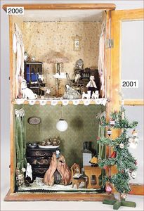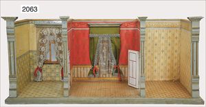 GOTTSCHALK kl. dreiteiliges Puppenstuben-Gehäuse, Jugendstil, 70 cm breit, 35 cm hoch, 2 Fenster, Durchgangstüren, Orig.-Tapete an Wand und Boden, Orig,-Bemalung, verzierte Frontleisten, schöne Gr., zum Einrichten