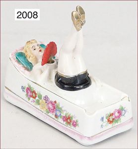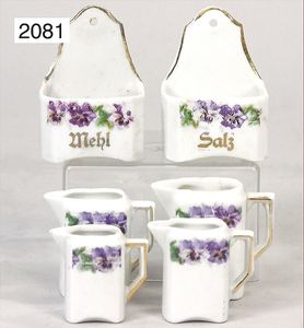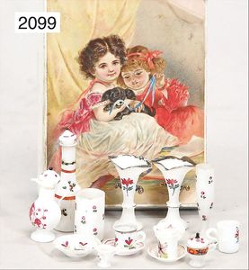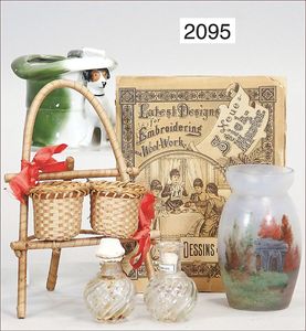 1 Vase, Hut mit Stock u. Hund, Höhe 7 cm, Halter mit 2 Körben, Glasvase, handbemalt, 2 Parfümflacons, 1 Dessins de broderie Dickvorlagen??, um 1900
