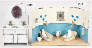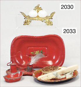 wohl MÄRKLIN Puppenstubenausschmückungsteile, Schreibzeug, 2 Schalen, kl. Seifenschale, Blech lackiert, 1 kl. Holzbürste, 1 Büste Bein