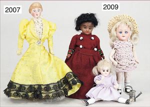 Biskuitporzellan-Kurbelkopf, Puppe, 12 cm, braune Schlafaugen, off. Mund, Masse-Stehkörper, dazu 2 Ganzbiskuitpuppen, 9 cm-11 cm