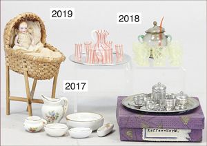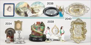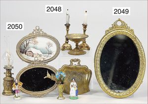 Konv. Puppenstubenausschmückungsteile, 2 Wandteller, Durchmesser 6 cm, 2 kl. Kartenspiele, 1 Puppenstubentischbild, Rahmen Messingblech, vergoldet, Rand emailliert, 2 Glashunde, 1 kl. Biedermeierspiegel, 6,5 cm