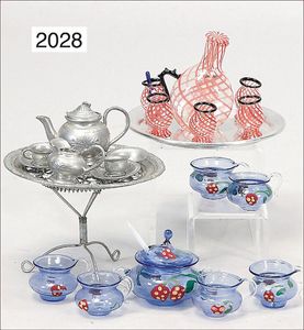 Glasbowleservice, ein Bowleservice Fadenglas auf Blechteller, 1 Zinnkaffeeservice auf Zinndrahttisch, Durchmesser 8 cm
