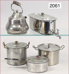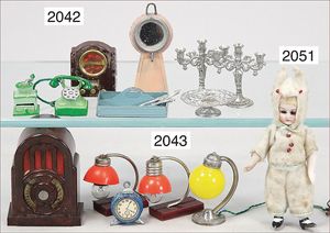 Konv. Puppenstubenausschmückungsteile, Zinn, Spiegel mit Garderobenhaken, 6,5 cm, 2 dreiarmige Leuchter, kl. Radio, Besteckkasten, Telefon, Kaffeemühle, etwas jünger