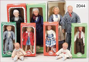 CACO 10 Teile, Biegepuppen, meist Masseköpfe, meist Blechhände, 2 Großmütter, Kinder, Krankenschwester, Orig.- Kleidung, 7 Puppen im Orig.- Karton