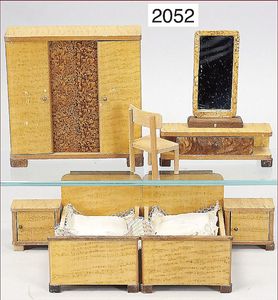 Puppenstubenschlafzimmer, Möbelprogramm, 50er Jahre, Schrankhöhe, 15,5 cm, 2 Betten, Nachttische, Spiegel, Stuhl, schöner Orig.-Zust.